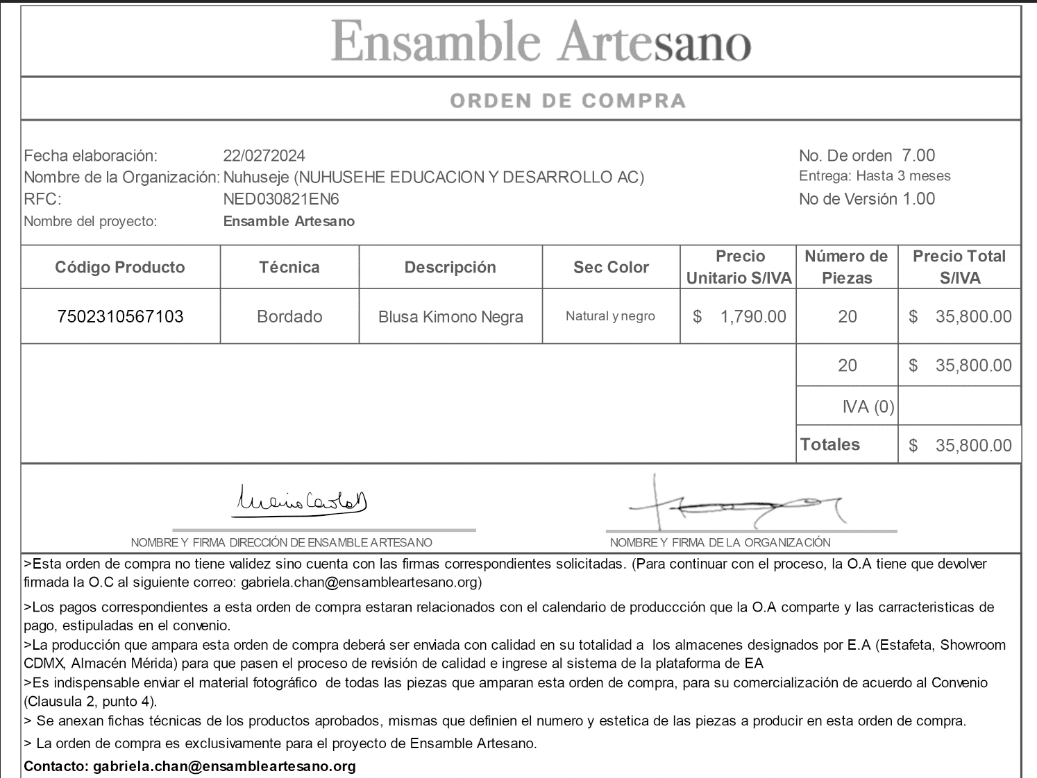 Documento que detalla una orden de compra para productos artesanales, incluyendo información sobre precios, cantidades, entregas y condiciones de pago.